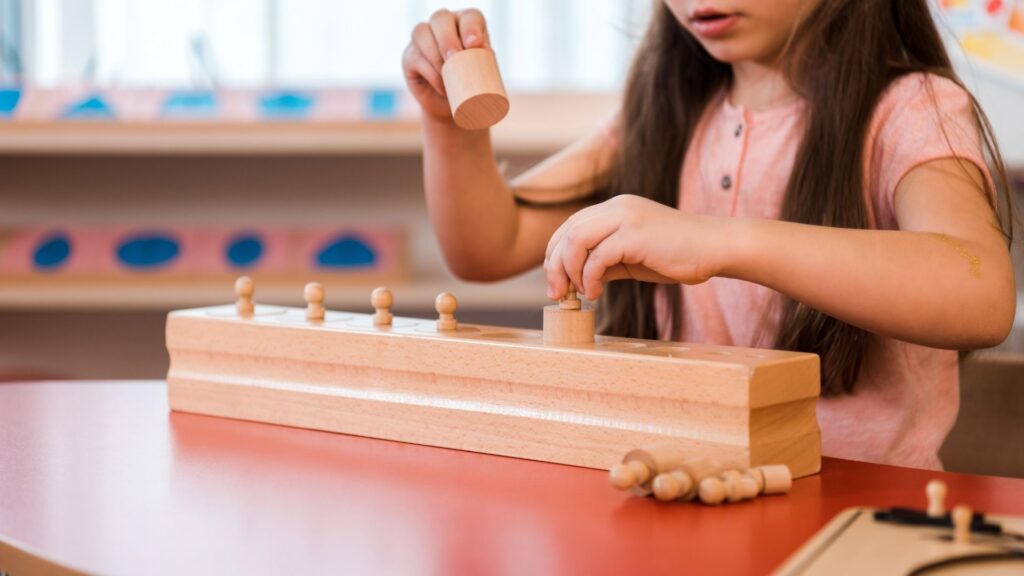La plupart des matériels Montessori intègrent le « contrôle de l’erreur ». Cette caractéristique permet aux enfants de repérer et corriger leurs propres erreurs, découvrant ainsi les résultats de leur apprentissage de manière autonome grâce à la répétition et à la pratique. Par exemple, les cylindres emboîtables que vous voyez sur la photo (à droite) ne peuvent entrer que dans une seule des dix cavités. De même, lors d’une activité de dénombrement, la quantité de matériel est toujours exacte, permettant à l’enfant de constater ses erreurs par lui-même.